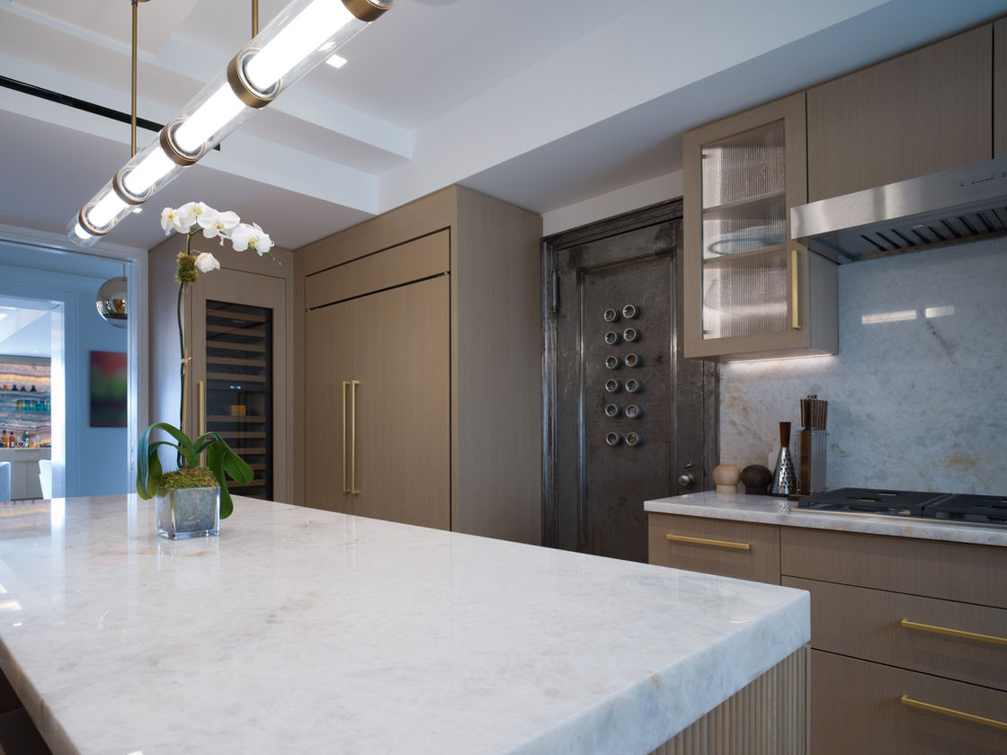 Extensive layout changes combined antiquated rooms, and created new passages among the pre-war plumbing risers and columns. We created a larger kitchen and a home office with hidden access to an adjacent bathroom. The entry sequence changed from a dark hallway greeting you to one with a view to the city with streaming daylight from larger portals to the living and dining room.