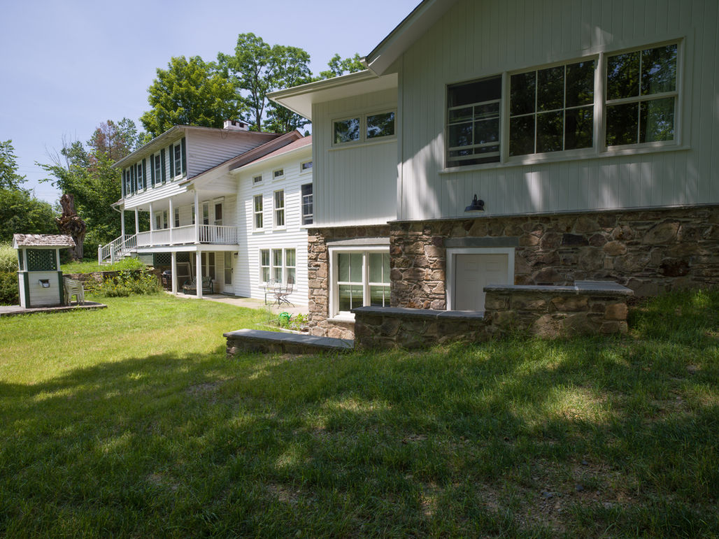 Parts of this farmhouse date back to the Revolutionary War, with many subsequent additions to the sides, out and above - designed more for the interior logic and needs than exterior organization. Built into a low mound, part of the nearby Shawangunk Mountains topographic features, the house faces away from the family pond on the opposite side of the mound.