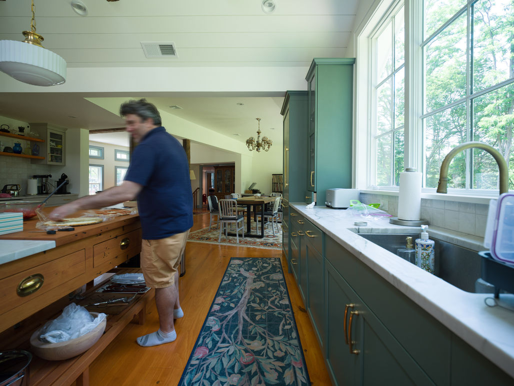 The family asked how could an addition work to give a large gathering room and a view to the pond? We first came up with a concept that would have minimal intervention with the historic and original house - hands off as much as possible. We create a symbolic time portal through one of the kitchen cabinets, leading you down a few steps, under the existing yard, to the new, modern grand room with an expansive view of the pond.
